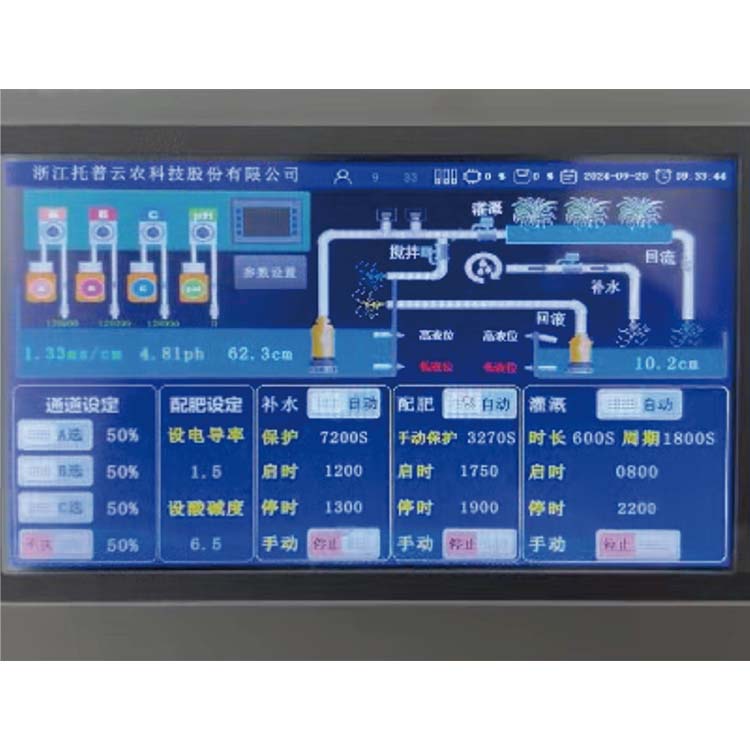 1、中央控制系统:10寸超大全彩触摸屏,可设置温度、湿度、光照、时间、模式等参数,具有实时以及历史温湿度、光照等数据曲线,设备运行状态显示,故障图形代码显示等专用功能。